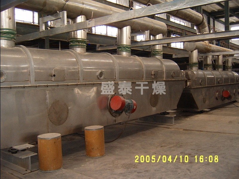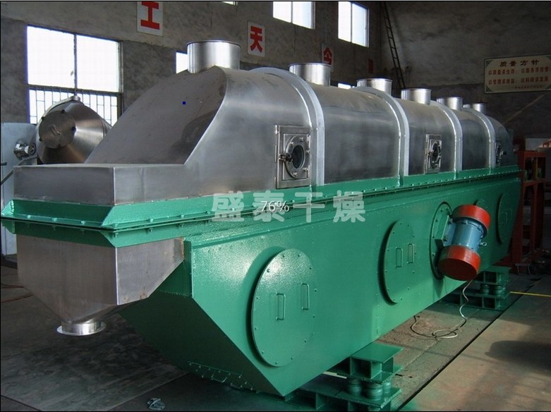 物料自進(jìn)料口進(jìn)入機(jī)內(nèi),在振動作用下,物料沿流化床水平方向拋擲向前連續(xù)運動,熱風(fēng)向上穿過流化床同待處理物料進(jìn)行熱質(zhì)后,濕空氣經(jīng)旋風(fēng)分離器除塵后由排風(fēng)口排出,干燥物料由排料口排出。