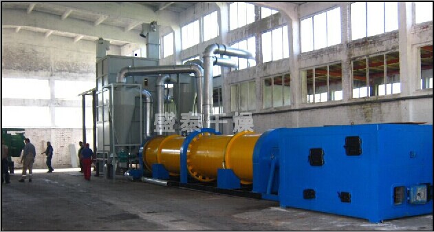 由高溫煙道氣作為介質,進入滾筒干燥機,采用順流干燥工藝,在筒體下部設有四個小滾輪,支承并帶動滾筒干燥機旋轉,由提升加料機把鮮葉輸送到加料口加入。濕料被熱空氣帶入旋轉的干燥機室內,物料在筒體內的抄板和氣流作用下,不斷向前,由此濕料與熱空氣充分接觸,產生熱交換,從而提高熱效率和干燥強度,被干燥樹葉離開干燥機隨即進入氣流去石器,將雜質除去,同時進入旋風分離器進行氣固分離,廢濕氣由風機抽出,干料經關風器排出。