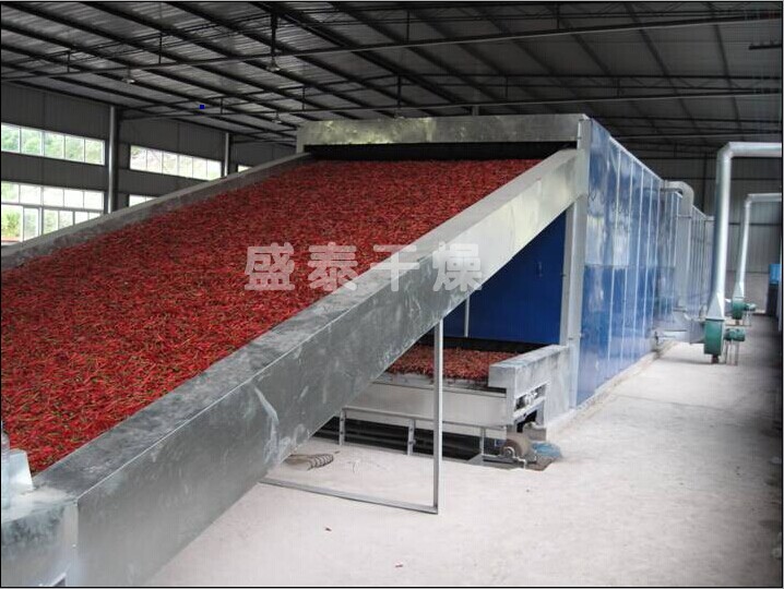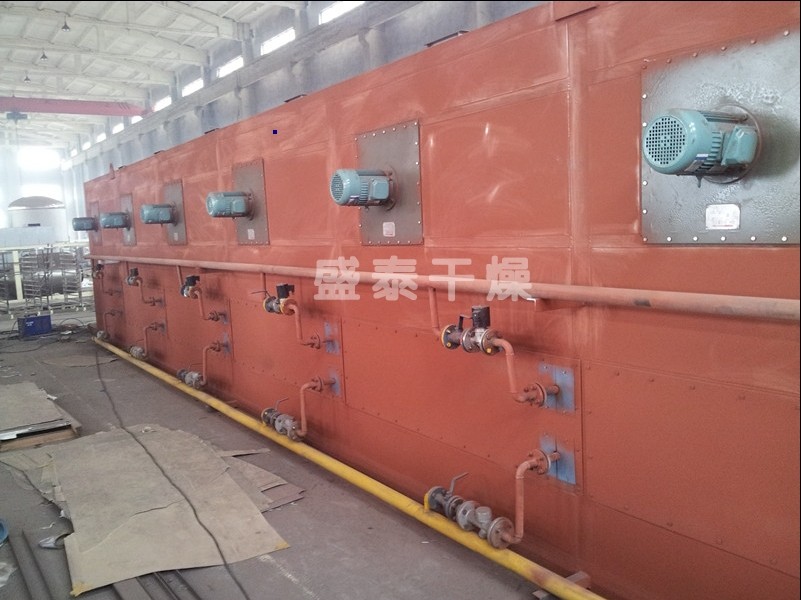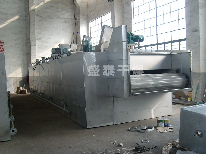 將需要處理的物料通過適當的布料機構,如星型布料機、擺動帶、粉碎機或造粒機,分布在輸送帶上,輸送帶通過一個或幾個加熱單元組成的通道,每個加熱單元均配有空氣加熱和循環系統,每一個通道有一個或幾個排濕系統,在輸送帶通過時,熱空氣從上往下或從下往上通過輸送帶上的物料,從而使物料能均勻干燥。
